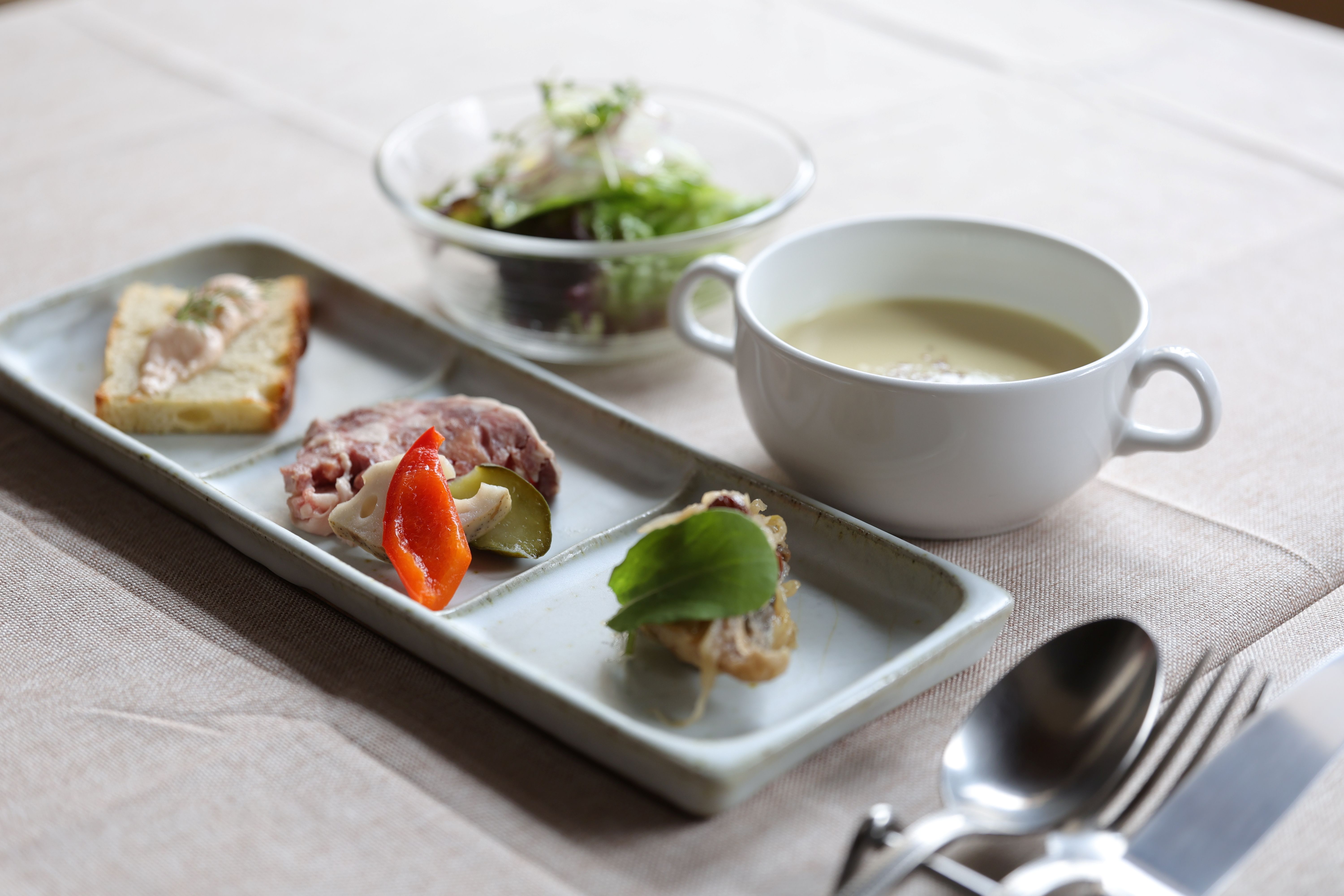 すべてのランチに前菜盛り合わせ、スープがセットになります